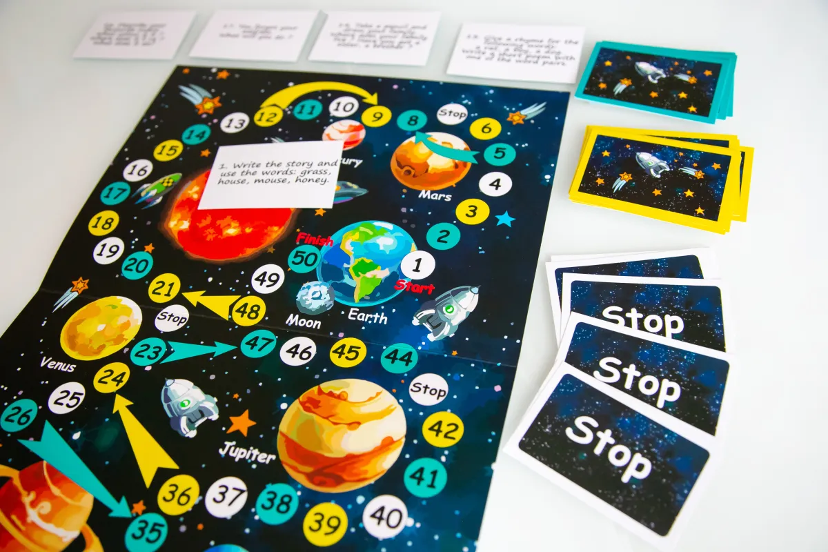 Мы попадаем в космос! Но не все так просто! Чтобы изучить все планеты, нам необходимо выполнить самые разные задачи и ответить на вопросы вселенского масштаба. Игра-ходилка с вопросами и заданиями для изучения английского языка. Три вида карт:
