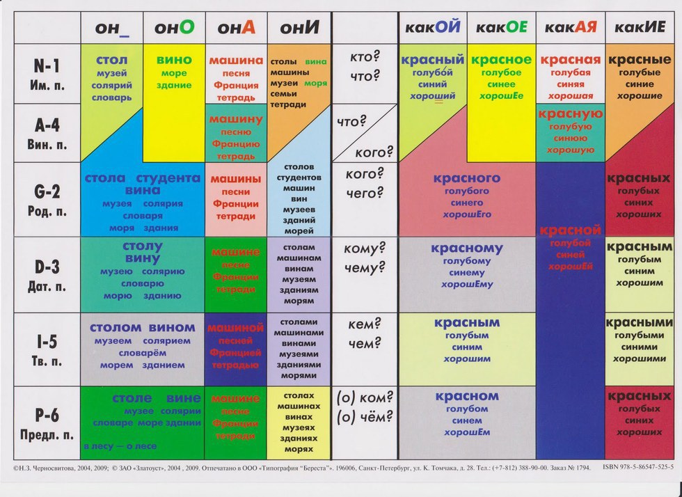 Для элементарного и базового уровня (А1-А2).Разноцветная таблица-подсказка, облегчающая запоминание и усвоение падежей русского языка.Рекомендуются для индивидуального использования, также будут полезны преподавателям.