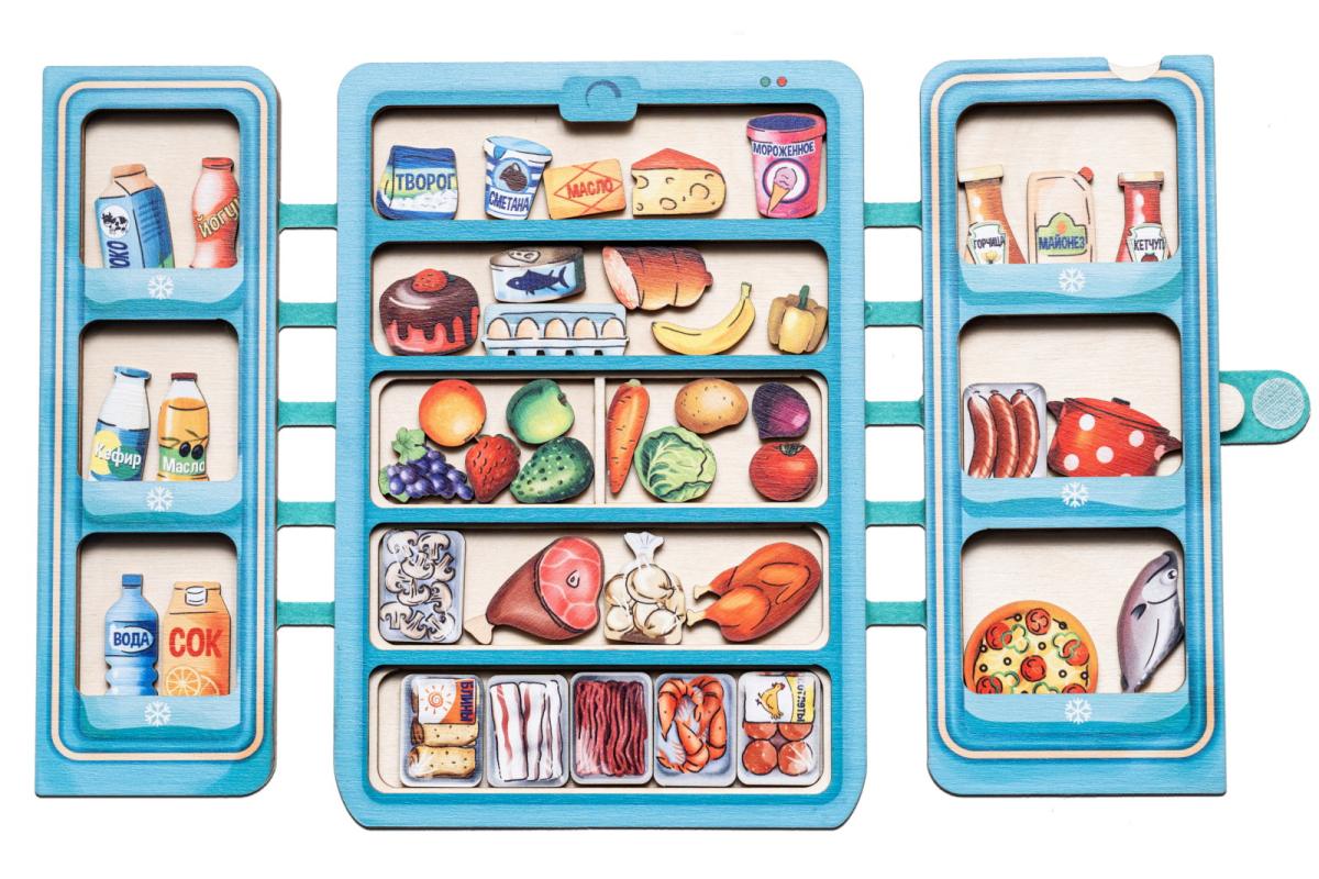 2. Игра «Разложи покупки». Расскажите ребенку, что, придя домой из магазина, нужно разложить все покупки по своим местам в холодильнике. Попросите ребенка помочь распределить все продукты по видам, например, овощи и фрукты в соответствующие контейнеры, а молочные, мясные продукты, морепродукты, напитки и соусы разместить на полках и боковых дверцах. Обсудите, какие продукты можно положить в морозильную камеру.