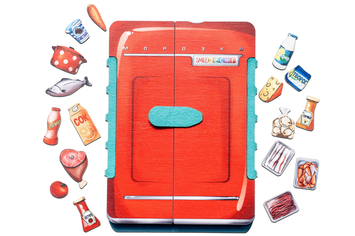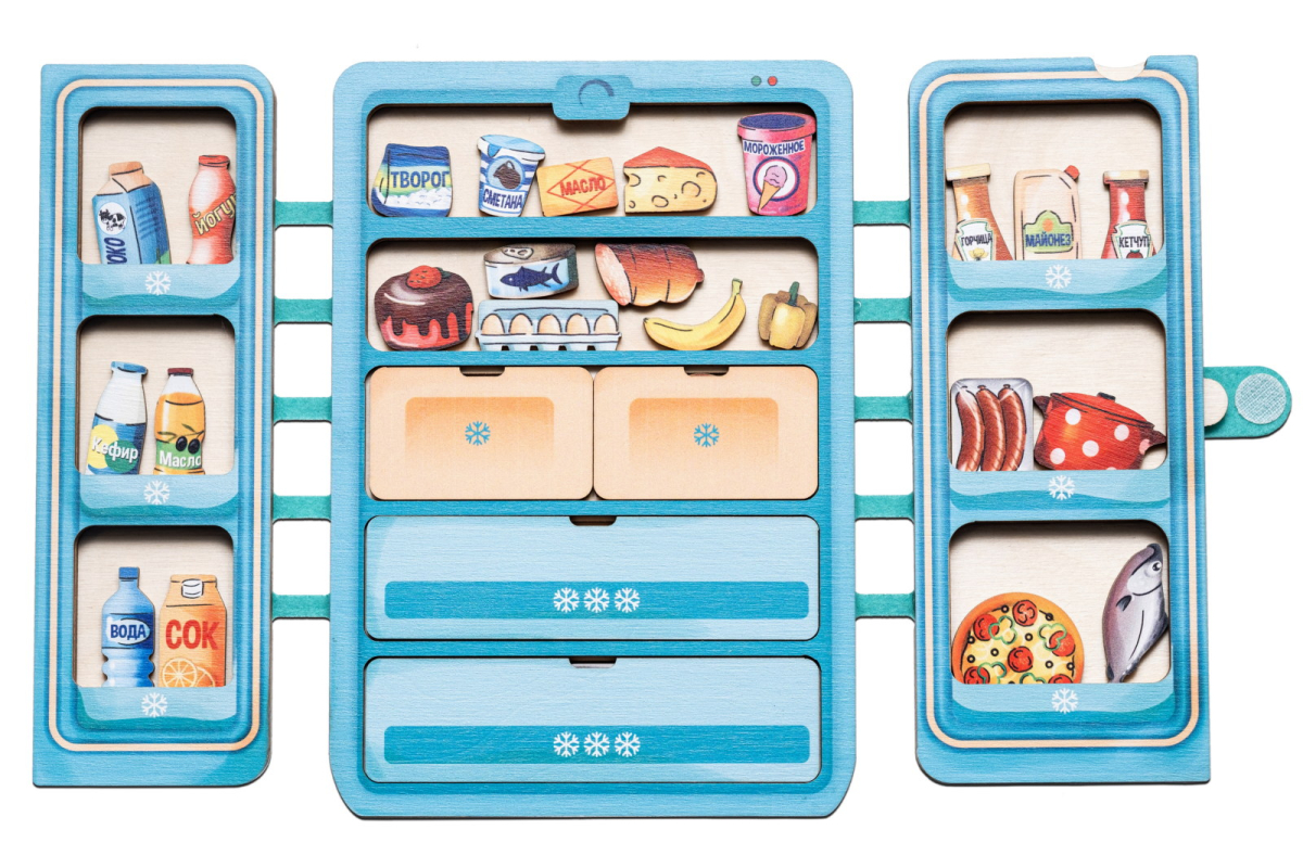 2. Игра «Разложи покупки». Расскажите ребенку, что, придя домой из магазина, нужно разложить все покупки по своим местам в холодильнике. Попросите ребенка помочь распределить все продукты по видам, например, овощи и фрукты в соответствующие контейнеры, а молочные, мясные продукты, морепродукты, напитки и соусы разместить на полках и боковых дверцах. Обсудите, какие продукты можно положить в морозильную камеру.