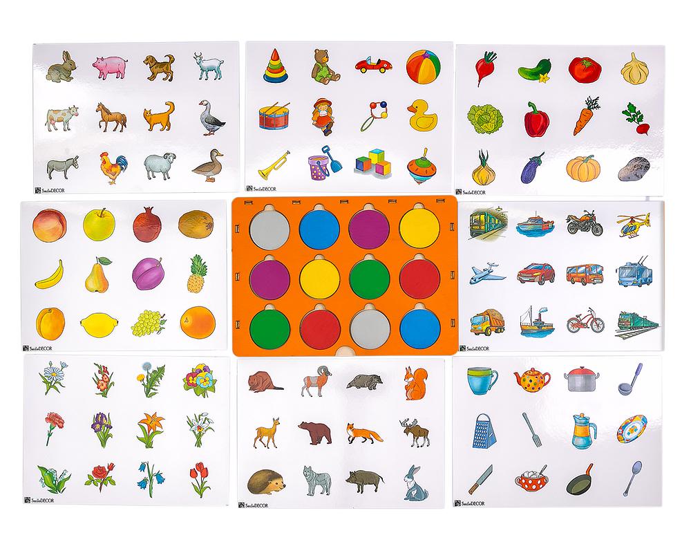 1. Выберите одну из тематических карточек и вставьте ее в планшет, закройте все окошки кружочками. Предложите ребенку постучать в любое окошко, спросите малыша, кто (что) прячется в окошке? Спросите ребенка, как можно назвать все картинки одним словом?